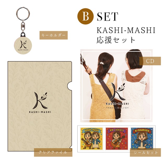 【 残り5個】 KASHI-MASHI 応援セット Bセット ・KASHI-MASHI シングルCD 「バカみたいに愛おしい日々」 ・シールセット ・キーホルダー ・クリアファイル 3500円(税込/送料込) ※Aセット/Bセットはクリアファイルとキーホルダーの絵柄が違います それ以外のセット内容は同じとなります 【CD概要】 弱音も希望もあの時の思い出も。 一緒に口ずさんでもらえたら、嬉しいです。 同じ気持ちを抱いている誰かに届きますように :::::::::: ୨୧:::::::::: ୨୧::::::::::୨୧::::::::::: 【各曲紹介】 1.バカみたいに愛おしい日々 子育ても、家族も、夫婦も、カップルも、友達も。 面倒くさい日々が一番愛おしい。そんな想いを紡ぎました。 ・ 2.やんなっちゃうなぁ 失うほど、手に入れていたものがあると信じたい。 擦り傷だらけの私達こそ人生の主人公。 やんなっちゃう日々が、笑い話になるまで、 やんなっちゃうなぁ。からまた、立ち上がる。 そんな踏ん張りを紡いだ曲です。 ・ 3.はらりはらり はらりはらり、未完成の幸せを抱いて。 大人になったからこそ、青春が問いかける。 叶わなかった夢が、まだ心で咲いていて。 半ばで止まった夢が、ずっと私達を動かして。 まだ心で咲いている。 置き去りの夢が、今を照らしているそんな想いを紡ぎました。